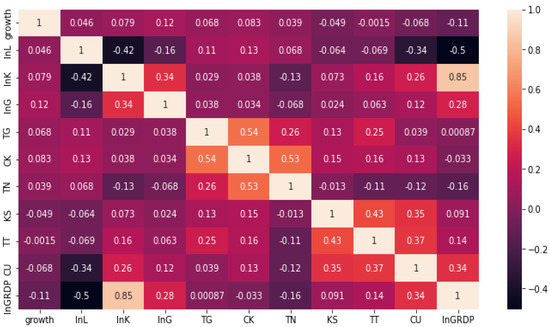 To be able to measure the degree of the linear relationship between two variables, the correlation coefficient is used. The correlation coefficient, which represents the correlation between a pair of variables, has a value from −1 to 1. Figure 2 shows that the correlation coefficients of the pairs of independent variables are all less than 60%. Therefore, the independent variables in the model have a low correlation with each other. However, the correlation coefficients of the pairs of independent variables LNG and L.LNGRDP, LNK and L.LNGRDP, and LNK and LNG are higher than 60%.