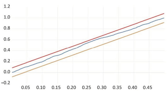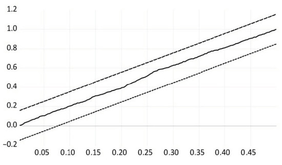 Spectral tests: Normalized integrated spectrum for the USA. Note: This test evaluates the null hypothesis that the data are stationary (white noise). It is based on the normalized integrated spectrum with the following statistic: , where I (ω(i)) is the ith maximum. The test statistic (vertical axis) is plotted against its frequency (horizontal axis). If the deviations of the statistic from the p/(n/2) line do not exceed ±a, the null will not be rejected, where a is set equal to 1.36 for 95% confidence.