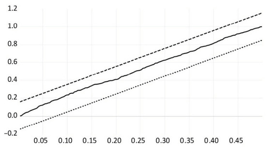 Spectral tests: Normalized integrated spectrum for the UK. Note: This test evaluates the null hypothesis that the data are stationary (white noise). It is based on the normalized integrated spectrum with the following statistic: , where I (ω(i)) is the ith maximum. The test statistic (vertical axis) is plotted against its frequency (horizontal axis). If the deviations of the statistic from the p/(n/2) line do not exceed ±a, the null will not be rejected, where a is set equal to 1.36 for 95% confidence.