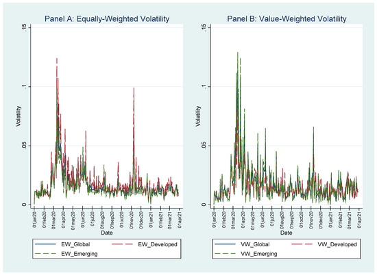 Volatility in international markets during the COVID-19 pandemic. The figure presents the average daily absolute returns on investment in travel and leisure stocks across countries covered. The presented measures of volatility are for the whole sample (solid blue line), the sub-sample of developed countries (long-dashed red line) and the sub-sample of emerging markets (dashed green line). The research period is from 1 January 2020 to 30 March 2021. Panels A and B report equal-weighted averages and value-weighted averages, respectively.