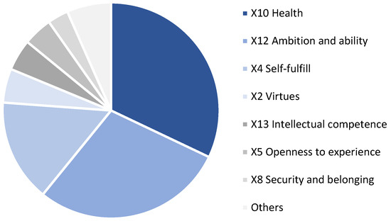 Together with self-fulfill (15.7%), they account for three quarters of the declared goals, with only another four goals, virtues (5%), intellectual competence (4.6%), openness to experience (4.4%), and security and belonging (3.1%) being mentioned more than three percent of the time.