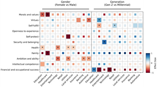 Linear regression coefficients for goal ratings vs. gender and generation. Impact size color coded: blue indicates higher values towards female or Gen Z; red higher values towards male or Gen Y. Large squares indicate uncorrected p-value < 0.05 and asterisks indicate p-value < 0.05 after Bonferroni correction.