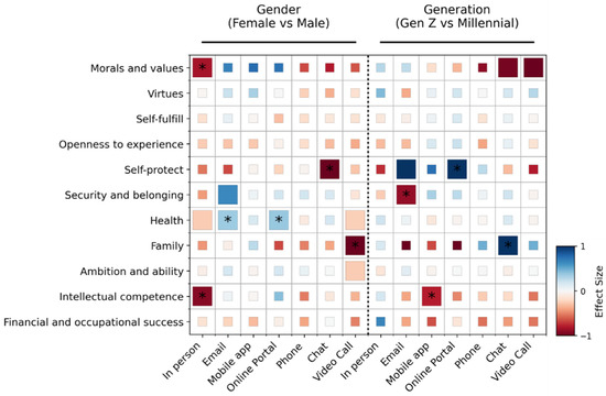 Linear regression coefficients for contact type ratings vs. gender and generation. Impact size color coded: blue indicates higher values towards female or Gen Z; red higher values towards male or Gen Y. Large squares indicate uncorrected p-value < 0.05 and asterisks indicate p-value < 0.05 after Bonferroni correction.