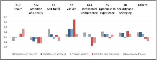 To investigate if gender or generational differences among individuals might play a role in the value ratings of each goal, the ratings of each goal with gender and generation were modeled as dependent variables. The resulting coefficients and statistical significance are shown in Figure 2. Female respondents are less confident in achieving health-related goals than males (β = −0.18, p = 0.015) and find both health (β = 0.09, p = 0.002) and ambition and ability (β = −0.33, p < 0.001) goals more emotionally draining than their male counterparts. On the other hand, virtue-related goals are rated more important by females than males (β = 0.49, p = 0.001). In terms of generational differences, Gen Zers rate intellectual-competence-related goals as less emotionally draining (β = 0.68, p = 0.003) and have experienced more previous success (β = 0.48, p = 0.017) than Millennials.