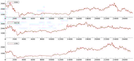 The data visualization apprehends the dynamics and behavior of the stock price series of “Habib Bank Limited, Muslim Commercial Bank, and United Bank Limited”. Figure 1 displays the series has a rising (downward) movement with huge fluctuations.