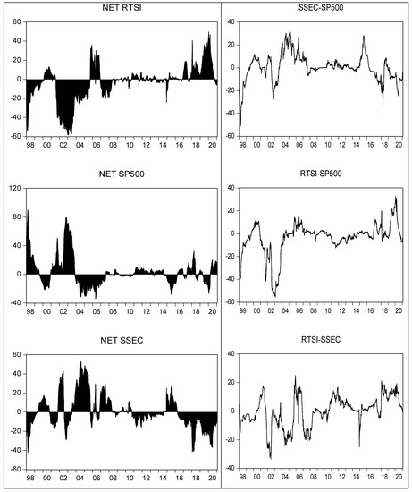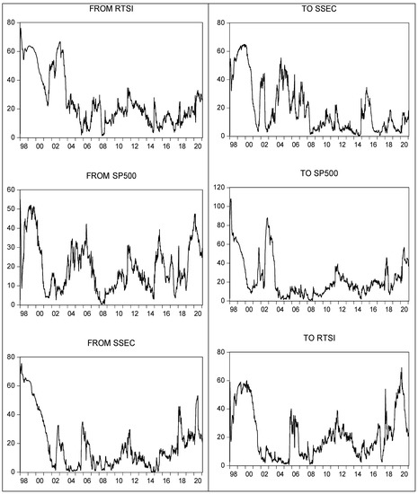Our empirical investigation shows that RTSI is the highest volatility receiver among the three markets. Russian RTSI receives 32.206% volatility spillover combined from the US and Chinese stock markets, which echoes the findings of Hassan et al. (2020) and Tiwari et al. (2021). Specifically, Russian RTSI receives volatility spillover of 24.188% and 8.018% from S&P 500 and SSEC, respectively. Nevertheless, the Russian stock market contributes 12.677% to S&P 500 and 10.305% to SSEC, implying that RTSI is the net receiver from S&P 500 and the net contributor to SSEC. Thus, RTSI is surprisingly the second highest contributor after the US stock market. Figure 1, Figure 2 and Figure 3 consistently highlight that RTSI received the highest volatility spillover in 1998–2000 due to Russia’s economic crisis and political unrest (Anatolyev 2005). We find that RTSI was a net contributor in 2005–2006, which is consistent with the findings of Fedorova and Saleem (2009) and Goriaev and Zabotkin (2006). However, for most of the period until 2016, the Russian stock market was a volatility receiver. The influence of RTSI significantly augmented from 2017 as the size of the market increased compared to previous years.