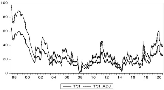 Table 3 highlights our first step of the analysis on connectedness among the three markets. The value of TCI is 26.15, which implies that the degrees of stock market synchronization are approximately 26.15% among our sample markets. The rows and columns of Table 3 indicate volatility receivers and contributors, respectively. The second row of Table 3 reports that the US stock market receives volatility spillover of 10.170% from SSEC and 12.677% from RTSI. Additionally, the findings imply that SSEC and RTSI contribute to S&P 500’s volatility spillover by 10.170% and 12.677%, respectively. The last column of Table 3 reports the degrees of volatility that each market receives, whereas the values in the fourth row indicate the magnitudes of volatility that each market contributes. Table 3 further highlights that the US stock market is the most diminutive volatility receiver and the highest contributor. Precisely, S&P 500 receives volatility spillover of about 22.84% from Chinese and Russian stock markets, and it contributes 37.30% to both markets. Our empirical findings align with those of Xu and Hamori (2012), who observe that the US stock market is the net volatility contributor to BRIC stock markets. Figure 1 represents volatility spillover from and to the three stock markets. Figure 2 provides more insight; for instance, in 1998 and 2002–2004 the US stock market was a net volatility contributor. However, Figure 2 further shows that S&P 500 was a volatility receiver from 2004 to 2007, which can be attributed to geopolitical turmoil, particularly the terrorist attack on 11 September 2001. Afterward, during the global financial crises (GFC), S&P 500 appeared isolated, as Figure 2 shows that the market received and contributed the least volatility. Consequently, the degrees of synchronization notabley declined during the terrorist attack and GFC, which is reflected in Figure 3. However, post-global financial crisis, S&P 500 again became a net contributor but at a lower magnitude comparing 1998. The US stock market was a net volatility receiver in 2015 when oil prices historically plunged due to shale booming. Our findings are partially in line with Schmidbauer et al. (2016), who argue that Chinese and Russian stock markets contributed to the US stock market significantly.