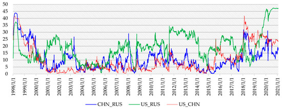 To assess the connectedness between the US, Chinese and Russian stock markets, we use daily data (five-day working week) on three stock indices and daily data of geopolitical risk. The indicator of geopolitical risk (GPR) is initially presented as monthly data and then converted to daily data. The sample covers 23 years, with a start date of 2 January 1998 and an end date of 29 January 2021, with a total of 6022 observations. For the US stock market, we implement Standard and Poor’s index (S&P 500). The S&P 500 index is calculated using the free float weighted market capitalization methodology. This approach excludes nominal shares allocated with exercise rights to executives and other interested parties. As an indicator of the Russian stock market, we implement the Russian Trading System (RTS) indices. The RTSI is calculated as the ratio of the total value of all shares at the moment of index calculation to the value of capitalization of all shares at the date of the first index calculation, multiplied by the correction factor (Aganbegyan 2011). The Chinese stock market is represented by Shanghai Composite (SSEC) indices calculated using the Paasche weighted composite price index formula. We implement the stated indices as the main indicators of the stock markets, which contain the largest asset capitalization among the companies. Therefore, we consider S&P 500, RTS and SSEC as the relevant and sufficient indicators for our analysis.