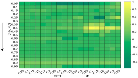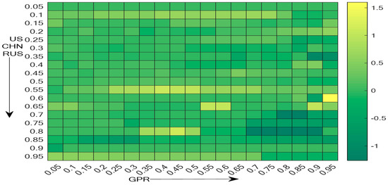 The response of RUS–CHN stock market synchronization to geopolitical risk. Note: The horizontal axis indicates the quantile of GPR, whereas the vertical axis is the quantile of stock market synchronization in ascending order. The right-side color bar indicates the intensity of the response of synchronization to GPR. The dark green and yellow colors indicate negative and positive responses and synchronization to GPR, respectively.