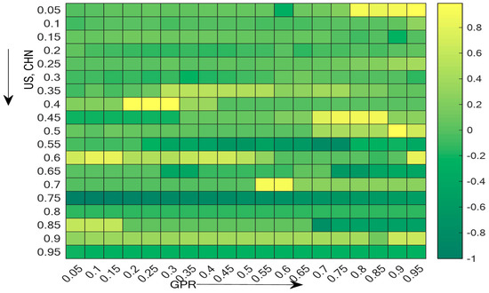 The response of US–CHN stock market synchronization to geopolitical risk. Note: The horizontal axis indicates the quantile of GPR, whereas the vertical axis is the quantile of stock market synchronization in ascending order. The right-side color bar indicates the intensity of the response of synchronization to GPR. The dark green and yellow colors indicate negative and positive responses and synchronization to GPR, respectively.