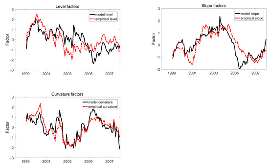We use three factors in the state equation since three principle components explain of the cross section variations of the 12 yields to maturities. Typically, the three factors are referred to as the level, slope and curvature factors. It turns out that the estimated three latent factors from our model are closely related with these three factors. Following Diebold and Li (2006), we define the empirical level factor to be , the empirical slope factor to be , and the empirical curvature factor to be . Figure 1 plots the estimated latent factors from the term structure model together with the empirically constructed three factors described above, after proper standardization.14 These graphs show that the estimated latent factors from the term structure model well track the empirical level, slope, and curvature factors.15 The plot of level factors reveals that the yields curve level overall has declined throughout the whole sample period. It is important to notice how well the model performs in terms of approximating all three factors. Specifically, the second latent factor and the empirical slope factor both declined for a number of years since mid-2003 until mid-2005 when they started to go up till the end of 2007. However, both the third latent factor and the curvature factor have decreased since mid-2005.
