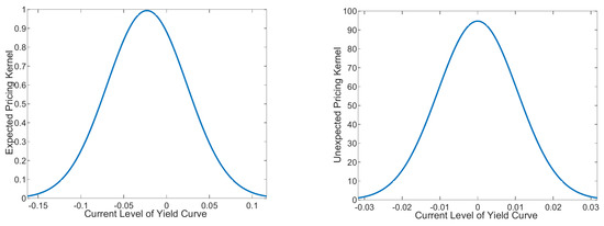 Given the estimate of the parameters for the yield curve we can examine the properties of the stochastic discount factor implied by the yield curve in the U.S. from 1999–2008. The expected (deterministic) (11) and random (10) components of the stochastic discount factor are graphed in Figure 2 using the parameters in Table 2. In Figure 2 (left hand graph (LHG)), at the stationary level of the yield curve, , the conditional expected stochastic discount factor is . Its maximum is , which occurs at . Thus, there can be a expected fall in the market’s valuation of securities for a increase in the level. In general, the impact of an expected decrease in the level of the yield curve is positive for and negative for . Finally, the standard deviation of the expected stochastic discount factor is more than four times that of the random component of the stochastic discount factor.