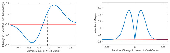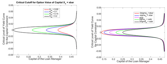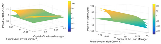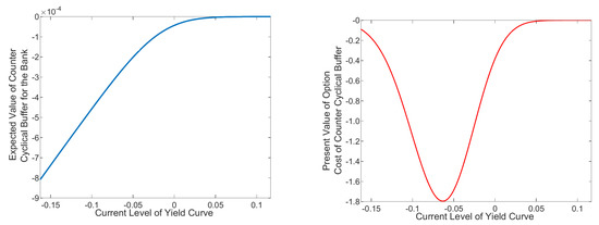 The expected payoff is multiplied in (25) by the expected stochastic discount factor, which has a normal form for the seller of a put option. As a result, the option value of the counter cyclical buffer for the bank is the mirror image of a normal form in the RHG of Figure 3. Recall that the stochastic discount factor is time varying as it depends on the level of the yield curve. The RHG in Figure 3 allows the level of the yield curve to vary over the interval . The highest value of the counter cyclical buffer is only , since and the probability that the buffer applies is small. If the regulator requires additional capital of for the counter cyclical buffer, the value of would have to be 100 times bigger.