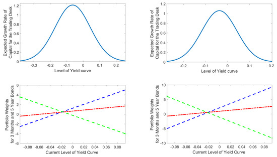 For , mean reversion (4) implies that the trading desk manager expects the level of the yield curve to fall, and hence longer duration bonds would lead to a larger capital gain. As a result, the trading desk is long five year bonds (blue dashed line) and short three month bonds (green short-dashed line) for a high expected level of the yield curve, . If the random change in the future yield factors is positive, , then the trading desk would suffer a large capital loss. The trading desk’s position is reversed for lower levels of the yield curve, , since mean reversion implies that the trading desk expects the level of the yield curve to move back to its stationary value by (4). If the random change in future yield factors is negative, then the trading desk would suffer a capital loss.