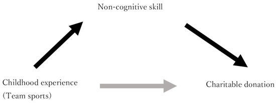 Mechanism by which childhood experiences cause persons to donate via the formation of non-cognitive skills. Notes: The shaded arrow exhibiting the direct effect, which is generally weak; childhood experiences are therefore appropriate for IVs.