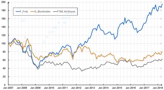 The empirical research presented in this paper is performed on monthly data of 116 listed non-financial firms belonging to the Italian stock market. These firms are the “survivors”, i.e., the ones still listed at the end of April 2018. The 116 firms are components of FTSE-MIB, FTSE Italia Mid Cap, FTSE Italia Star, as listed on website www.borsaitaliana.it (accessed on 1 July 2018). The financial data are collected from the Bloomberg database, from January 2007 to April 2018. The data on shareholding structures of each firm were obtained by the Orbis database, while the data on board composition of each firm are obtained by CONSOB, the Italian financial supervisory authority (www.consob.it, accessed on 1 September 2018). Information about family history, kinships, and affinities with founders was provided by companies and other authoritative sources.