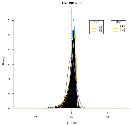 - Finally, we compared all three calibrated risk-neutral distributions of the standardized spot’s price (the rescaled spot priced, , where ) as obtained under the Black–Scholes (BS), Generalized Gamma (GG) and Heston (1993) option pricing models (HS).