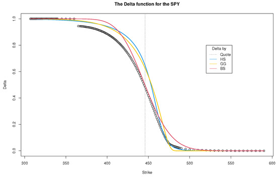 The impact of this model’s misspecification on the calculated delta values associated with the option series is also of interest. It is a standard practice of the retail brokerage houses to provide, along with the market prices for the option chain, also the BS-base calculated delta for each strike (using some ATM implied volatility value). For example, for the ATM strike of , the quoted delta is with a quoted of , whereas under the BS model we calibrated here with , we obtained . However, accounting for stochastic volatility in the pricing model, we calculate for this same strike, , by the (better fitting) Heston SV model, and , by its close proxy, the GG model. Thus, in this case, the BS modeling at the ATM strikes will result with grossly understated delta values (of nearly 25.0%). Without doubt, the impact of this model’s misspecification would have profound hedging implications for the retail trader. To fully appreciate the extent of this impact, we present in Figure 3 the values of the delta function (9) as was calculated for the HS model (using and (A1)), for the GG model (using (17)) and for the BS model (using from (1)), along with quoted delta values for the SPY chain.