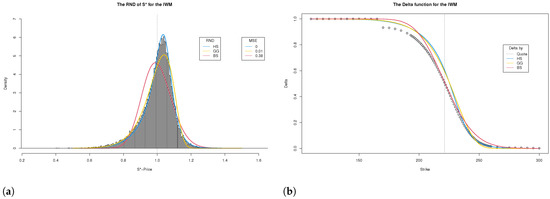 The IWM case: (a) the HS, GG and BS implied RNDs along with the Monte Carlo distribution of the Spot’s price , and (b) the corresponding delta functions along with the quoted delta per each strike K in the option series.