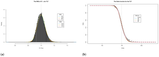 The situation with the other two market index ETFs, IWM and QQQ, is very similar to the one describing the SPY—see the corresponding depiction of their volatility ‘smiles’ in Figure 1. Following a similar calibration and validation approach, we present (implied) the price distributions derived from the IWM option data shown in Figure 4a and the QQQ option data shown in Figure 5a. The calculated values of the corresponding delta functions are displayed in Figure 4b and Figure 5b. Furthermore, to serve as a contrasting illustration, we present in Figure 6 the three implied price distributions derived from the TLT ETF option series, along with the corresponding calculated delta functions for that ETF. The situation with the TLT ETF is clearly different, as compared to the three market index ETFs (SPY, IWM and QQQ) which exhibit a pronounced skew of their volatility ‘smile’. In the case of the TLT) ETF, with a relatively intact volatility ‘smile’ (see Figure 1), the implied RNDs are relatively symmetric, and the three option pricing models (HS, GG and BS) yield very similar results. In Table 2, we provide a summary of the goodness-of-fit of each of the pricing models as measured by the respective MSE for each of the four ETFs. A corresponding comparison of the ATM delta calculations under each of the option price models is presented in Table 3. In Table 3, we provide a summary of the goodness-of-fit as measured by the respective MSE for each of the ETFs. Some of the technical details are provided in Section 4.1 below.