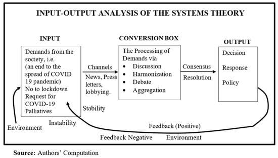 Systems theory, first propounded by David Easton (1965) but further improved by Fisher (2011), aptly fits the explanation of budgetary allocation and the response of the government to the pandemic in Nigeria and South Africa. Environmental problems or social issues are parts of an interrelated whole system (Amusan and Agunyai 2021; Hassan et al. 2020). According to this theory, the political system is defined as the interaction or set of interrelated components and processes through which binding or authoritative allocations are made in any society. The theory stipulates that the system, that is, the political system, through the input device, receives complaints about certain societal problems requiring government attention or response or that society makes demands (for a particular policy or action) on the system through an active input device. Society transmits its demands into the system (conversion box) through different channels.