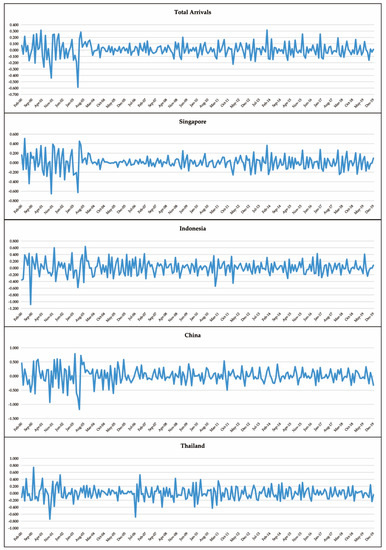 The study employed the monthly log difference of data on tourism demand from Figure 3 for data analysis. First, statistics on arrivals into Malaysia from a total of 54 countries/regions on every continent were retrieved. The second stage is to analyse the gathered data for outliers, missing data, and insufficient time range in order to obtain more accurate modelling and prediction outcomes. A total of 26 countries/regions failed the initial examination, while 28 countries/regions were included in the study. The data filtering process was repeated in the specified nations in the third stage. The sub-steps include, (1) comparing the monthly visitor data from 28 nations or regions. This is because the number of visitors entering Malaysia from certain nations is extremely low, even close to ten, and such data is insufficient for producing more accurate modelling and prediction results. (2) For modelling, audited data must be translated into a specific range (log return) because some data are too large. (3) An improved Dickey–Fuller (ADF) test (Lim and McAleer 2000) and a Philips–Perron (P.P.) test (Phillips and Perron 1988) were used to detect and evaluate the presence of a unit root test and the consistency of the log difference of time series for volatility analysis and these tests were used independently of every dataset. On the basis of the aforementioned selection criteria, nine nations or regions were ultimately chosen for this study. In the fourth step, we used the nine identified inbound tourism market data in Malaysia to conduct cluster analysis and structural fault analysis in order to gain a clearer and more comprehensive understanding of whether the data is affected by different news shocks at different times. Importantly, we employed the conditional mean equation to investigate the monthly seasonality and the link between the series to create the residual values for the variance equations. The next thing that needed to be performed was a statistical analysis of εt to determine whether it met the criteria for modelling and whether or not it had attained the standard. Through diagnostic testing of the residuals t values in the conditional variance equations, the monthly Malaysian tourism demand volatility models with five financial news shocks were evaluated in the fifth stage. These tests were conducted to determine whether or not these models exist. The variance equations and three approaches to financial news shocks utilised in this study were stated from the news impact curve for the symmetric and asymmetric impacts analysis, followed by the evaluation of several models of volatility by subjecting them to news shocks to determine which model provides the most accurate estimate when applied to the within-sample data of the international tourism demand volatility in Malaysia within the sixth step. In the seventh step, forecasting evaluation criteria (MAE, RMSE, and Theil-U) are applied to determine which of the models is the best forecasting model for the volatility forecast of international tourism demand and which has the most significant news shocks impact on the tourist arrivals into Malaysia between the in-sample evaluation and out-of-sample forecasting procedure. Finally, a summary was compiled, and the findings yielded in this study were assessed if they achieved the study’s purpose.