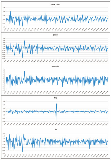 - Nelson, Daniel B. 1991. Conditional heteroskedasticity in asset returns: A new approach. Econometrica: Journal of the Econometric Society 59: 347–70. [Google Scholar] [CrossRef]
