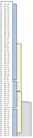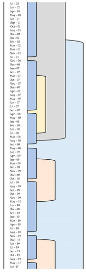 In a similar fashion, Figure 5 depicts five financial indices over six distinct time periods. The years 2001–2003 are represented by the spectrum’s dark purple, pale yellow, and grey. There are groups for 2007, 2008, and 2009 represented in varying tones of dark purple, pale yellow, and grey. Years 2012 and 2013 were the most prevalent years for the buff, grey, and green clusters. In 2014, there were dark purple, yellow, and grey groupings for each of the three cohorts. Except for grey, groups from 2017 to 2019 are represented in all but one of their colour groupings. In Table 2, DXY in Cluster 1, CO in Cluster 2, GP in Cluster 3, KLCI in Cluster 5, and S&P500 in Cluster 6 exhibited the highest values of tourist arrivals, respectively. Consequently, the various financial indices will exhibit distinct movements in their respective groupings throughout time. The preceding data will be analysed in conjunction with the subsequent section on structural breaks.