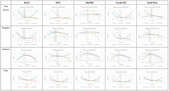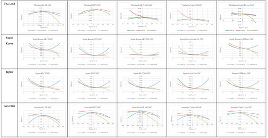 The asymmetric GJRGARCH model makes it possible for the conditional variance to respond differently to bad and good news while the leverage effect is being evaluated. This is achievable due to the fact that the model allows for the examination of the conditional variance. Depending on γ > 0 and γ ≠ 0, the sign of γ in the GJRGARCH models may indicate that the asymmetry and leverage effects are significant at the 1%, 5%, and 10% levels, respectively. On the basis of these data, it can be concluded that negative financial news shocks are a crucial factor that considerably affects and influences the monthly volatility of tourist demand in the GJRGARCH (1,1) model presented in Table 9. In the GJRGARCH (1,1)-KLCI model, the GJRGARCH (1,1)-DXY model, the GJRGARCH (1,1)-S&P500 model, the GJRGARCH (1,1)-CO model, and the GJRGARCH (1,1)-GP model, for instance, there are both leverage and asymmetry impacts in South Korea, Japan, Australia, and the USA, respectively. Meanwhile, there are leverage or asymmetric impacts on all other nations in the GJRGARCH (1,1)-CO model and the GJRGARCH (1,1)-GP model, correspondingly, with the exception of the UK and Indonesia. The GJRGARCH (1,1)-KLCI is the indicator that has the least amount of leverage or asymmetrical impacts on all nations. The news impact curve allows one to examine all of these things and more.