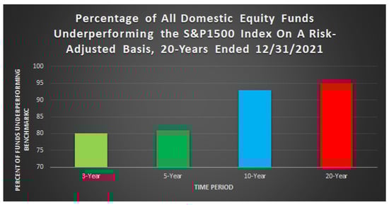 SPIVA research results on active funds vs. index benchmarks over the 20-year period ending 31 December 2021. Measured on a risk-adjusted return basis, a staggering 95% of all domestic equity funds underperformed a key benchmark (S&P 1500) over the 20-year period. Even when measured in absolute terms, that figure is still 90%. Finally, similar results hold in all categories of managed funds underperforming their respective benchmarks (Coleman 2022).