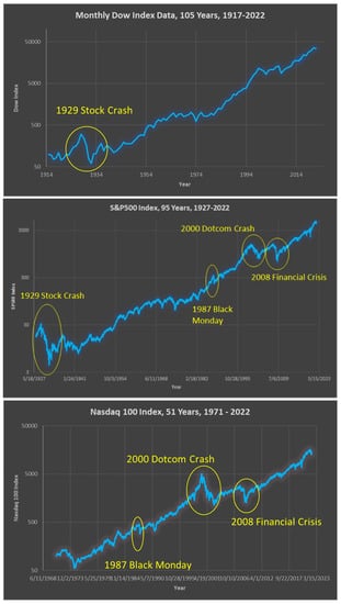 For our purposes, we use even simpler strategies and show that they can still be effective, by extensive backtesting. The very first thing to note is that stock markets generally tend to go up over time. That of course is the basis of all investing. It is worth looking at the charts in Figure 6, showing a century of growth, right through the World Wars and Depression, a breathtaking fact. We present the 105-year Dow, 95-year S&P500, and 51-year Nasdaq charts, with data from (macrotrends 2022), all on a logarithmic scale. The consistent growth should inspire confidence that stock investing will likely be profitable in the long-term going forward. Unfortunately, most investors are not hitching on to this ride consistently. Although the charts do show a generally upward trend, the second thing to note is that it is not a straight line up, that there are many dips along the way, and, occasionally, very deep stock market downturns, especially the famous 1929 crash, visible in the Dow and S&P500 charts. In addition, the careful observer will notice the 2000 Dotcom crash and the 2008 financial crisis, leading to massive downturns. The 1987 Black Monday one-day crash of 20% is a bit harder to detect at this scale, but those who lived through it remember it well. Together, these are known as Black Swan events, which can be devastating. Even for the casual observer of these charts, the question arises: Is there a way to obtain the nice growth of these indices, but somehow avoid the few main market crashes (even partially)? If so, that would be a winning strategy. To work in that direction, we first summarize these observations. They form the basis of our market timing approach: