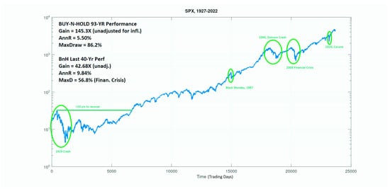 S&P500 (SPX), 30 December 1927–1 April 2022, graphed for 94 years (tested 93+ years due to MAs). The market trends upwards, but it has many dips and valleys. The buy-and-hold (BnH) performance is given for the past 93 and 40 years. For convenience, the x-axis is now time in trading days.