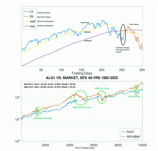 (top) Example of Algorithm 1 in action, with a segment of the S&P500 data, showing key elements. When SMA(50) crosses below the SMA(200), the method switches from long to short or cash, and vice versa. (bottom) Performance of Alg1 vs. BnH, on SPX, 1982–2022. Alg1 underperforms simple BnH, but it reduces drawdowns. That in itself may be a benefit for small investors.