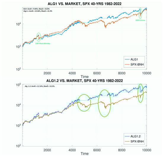 In our simulations, we invest $1000 just once in the beginning and track the performance of trading algorithms in both growing that amount, as well as in the drawdowns (or percent losses) along the way. Specifically, we measure the performance of trading algorithms using: (a) the raw, unadjusted gain as a multiplier on the initial principle (here, assumed to be $1000); (b) the annualized return as a percentage (e.g., a 10% return is a multiplier of 1.1×); the maximum drawdown as a percentage. The approach can be extended to include both periodic and irregular investments as well, but our streamlined simulations will be indicative. With these preliminaries, Figure 7 shows the performance of BnH on the SPX for 93 and 40 years, while Figure 8 shows the performance of our Algorithm 1 vs. BnH on the SPX for the past 40 years. It indicates that while Algorithm 1 fails to outperform BnH in this period, it does at least reduce drawdowns to more manageable levels (33% vs. 57%). Moreover, that drawdown protection seems to be consistent, even holding flat during the 2000 Dotcom and 2008 financial crises. However, note that the Black Swan events of October 1987 and the COVID-19 outbreak do trip up Algorithm 1, just as they do BnH. This is a problem to address for algorithmic trading. We remark that Algorithm 1 makes only 36 trades in the 40-year period, or about 1/yr. This method is already useful for many investors, whose risk tolerance may be limited. Of course, for some other investors, the loss of performance may be a non-starter.