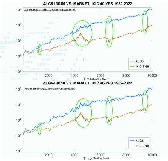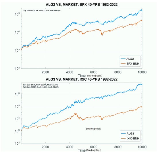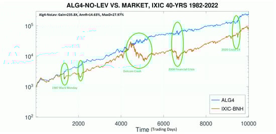 We call our approach FastHedge, which includes both fast growth due to leverage (typically under 2×), as well as hedging by going inverse the underlying when needed. To simplify matters, we only used actual leveraging in the positive direction in our simulations. Even with this large library, since there is no learning, our sims compute in seconds for a 40-year data record, even on a laptop. However, importantly, these elementary methods can still be effective. We now show what is possible with this machinery. For the SPX, we present results for an algorithm called Alg2 from the library, which definitively improves on BnH on SPX. For Nasdaq (IXIC), we present results for a method called Alg3, which in fact provides excellent results (Figure 11). Both of these provide superior performance, while still constraining drawdowns to some extent, with Alg3 on Nasdaq especially noteworthy. Moreover, these performance gains are consistent across the time periods, negotiating both major market crashes and the special Black Swan events. While these Black Swan events continue to be challenging, their impact has been partly controlled while still obtaining excellent gains in Alg2, and much more so in Alg3. In fact, Alg3 explicitly overcomes the 1987 Black Monday and actually benefits from the 2000 Dotcom crash, which is remarkable. These strong results indicate that this method is applicable to both professional and individual investors for long-term investment performance. In turn, these high performance levels also suggest that major Black Swan events often have some kind of tell-tale early markers that our algorithms are subtly picking up on.