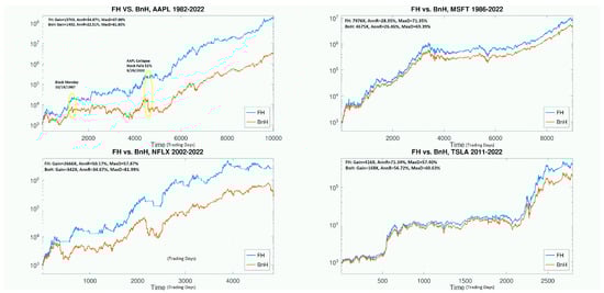 While our main interest is in trading major U.S. market indices such as the SPX and IXIC, we also tried our hand at trading individual stocks, including the well-known AAPL, MSFT, NFLX, and TSLA stocks that many other authors have tested, for comparison; see Figure 15. We applied the same FastHedge architecture with the same settings on these stocks. We obtained the following results. In this case, we made no effort to find the best performance, only some exemplary good results, to indicate that the method indeed applies broadly to stocks as well. (So far, Forex trading seems more challenging for our method, which is to be investigated.) From the graphs, we note that while AAPL and NFLX are profitably tradable, it seems that MSFT and TSLA are much less so, where good results are not very different from the underlying. MSFT had a truly spectacular 36-year run, and it seems it can hardly be improved by our methods (without magnifying the max drawdown unacceptably). Likewise, the meteoric rise of TSLA can still be improved a bit, while clipping some of its drawdowns. Note that as we are using a log scale on the y-axis, even small gains are quite significant.