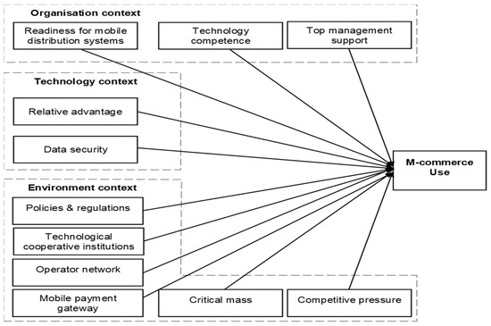 Furthermore, other relevant technology support infrastructure may also encourage businesses to try new technology (Tornatzky and Fleischer 1990). Other studies have highlighted that, before the adoption of m-commerce, businesses are required to evaluate the national mobile operators’ network quality (Maritz 2014; Poulson 2014; GSMA 2015; Chatterjee et al. 2021), the availability of electronic payment gateway systems (Masihuddin et al. 2017; Yang and Lin 2018; Chatterjee et al. 2021), and the availability of government and/or nongovernment technological co-operative institutions in the economy (Chatterjee et al. 2021). This suggests that there should be at least a: nationwide public mobile operator available, able to overcome the long distances by providing timely access to mobile services; payment gateway that plays a central role in the interaction between the stakeholders involved in the mobile electronic payment systems; and technological co-operative institutions that exercise elements of control and online arbitration, and provide support or direct subsidies towards ICT infrastructures and training of personnel of the business (The Earth Institute & Ericsson 2016).