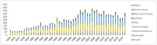 - Our World in Data. 2019 Global Reported Natural Disasters by Type, 1970 to 2019. Available online: https://ourworldindata.org/grapher/natural-disasters-by-type (accessed on 23 April 2022).