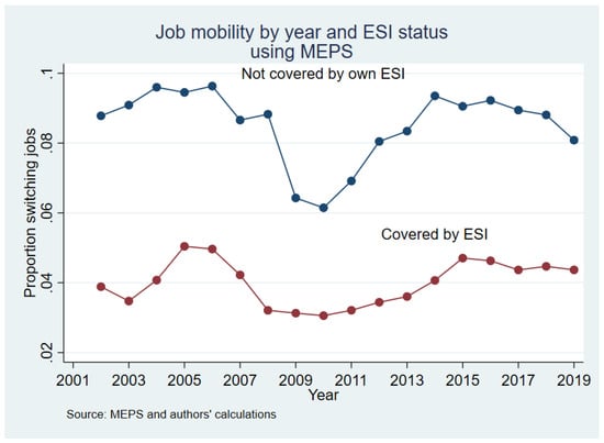 We address this knowledge gap and contribute to this literature in several ways. First, we analyze the effect of the ACA on job-to-job mobility, and specifically on job mobility after the ACA fully took effect. Second, we measure job mobility among those most likely to be affected by the policy, which is workers with health conditions that, prior to the ACA, were likely to be denied or delayed coverage if they changed jobs because they had “pre-existing conditions”. Further, we identify the effect of the ACA on job mobility through a strategy that is both robust and chosen by many prior researchers on this topic, most of whom have found a substantial effect of employer-sponsored health insurance on mobility. Our study uses 2001–2019 data from both the Current Population Survey and the Medical Expenditure Panel Survey. This long time period allows us to track the evolution of job lock over time, and estimate its recent strength following the full implementation of the ACA.