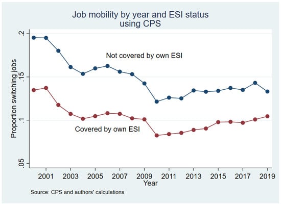 In Equation (1), OwnESI represents a dummy variable indicating that the worker has insurance through the worker’s own job; the cost factor is either the availability of insurance through the worker’s partner or family, or one or more health conditions that has led to a denial of coverage before the ACA went fully into effect in 2014; the vector X includes worker characteristics such as educational attainment, race and ethnicity, age, and job characteristics such as industry and occupation; and represents the fixed effects for year. The parameter of interest is , which captures the effect of ESI on mobility after removing the independent effect of the cost factor on mobility. We estimate this model for the 10 years before the ACA took full effect in 2014, and also from 2014 through 2019, when insurance companies were no longer allowed to deny coverage based on pre-existing conditions. We omit data from 2020 onwards in order to avoid the tumultuous disruption of insurance coverage and employment caused by COVID-19.