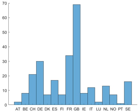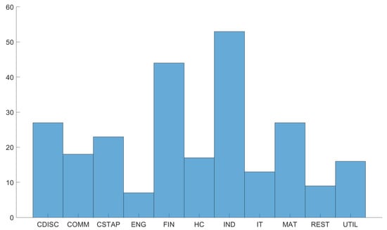 After compiling the data from these sources based on availability, we had 254 stocks for which we had the necessary data available for all these variables. To recognize the data better, we present the bar charts to show from which countries and sectors these come from. The names of the countries and sectors are abbreviated, but the full names are available in Table A10 and Table A11. From Figure 1, we can see that most of the firms in our data are from Great Britain, followed by France, Germany, and Switzerland. The least represented ones in the sample are Austria, Luxemburg, and Portugal. In our analysis, we considered the subsample of southern countries consisting of France, Spain, Italy, and Portugal. This subsample is largely led by France and Spain. Figure 2 shows that we have many firms from the Industrials and Financials sectors, followed by the Consumer Discretionary and Materials sectors. The least represented ones are the Energy and Real Estate sectors.