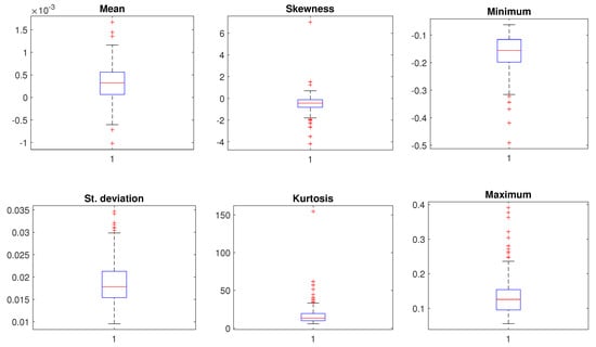 In Figure 3, we present the time series plot of the returns of all 254 stocks in our sample. As we can see, there are some positive and negative outliers in each series. The econometric model we discussed in Section 3 considers these outliers when modeling the returns. In Figure 4, we present the boxplots of the descriptive statistics of the return series. For example, the subfigure that corresponds to the mean shows the boxplot of the vector containing the means of each return series. In this figure, we can see that the average return for half of the stocks is slightly positive, between 0 and 0.00005. There are some return series that have relatively higher standard deviations. When we look at the skewness, we see that most series are negatively skewed and some series have strong negative skewness. Finally, as expected, the kurtosis is quite high, attracting attention to the fat tails of the return distributions.