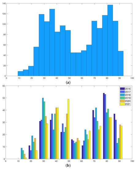 In Figure 5, we present the histograms of the ESG ratings for all the firms and years, as well as year by year. From the pooled ESG ratings, we can see that the distribution is bi-modal and there is about a 40–45-point difference between the two modes. When we look at the histogram by years, we see that in the higher end of the distribution, the number of firms with high ESG ratings declined over the years. The numbers were especially high in 2016 and 2017, and after that, they declined. In the lower tail with ESG ratings of less than 30, we also see that the number of firms declined in 2021. On the other hand, we see an increasing trend over the years for the mid-range ESG ratings. For example, in the 40–50 range, we see that the number of firms increased. We can also say that with COVID-19, the number of firms in the mid-range increased. This means that some firms in the lower tail started to invest in ESG-related activities more, while some firms in the higher tail engaged less in ESG-related activities.