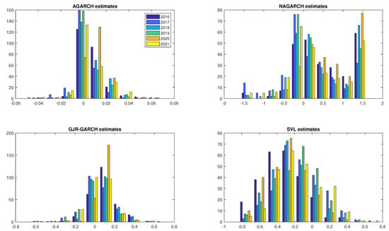 The coefficients for the asymmetric effects and leverage effects obtained from the AGARCH, NAGARCH, GJR-GARCH, and SVL models are presented as histograms in Figure 6. In these histograms, the bars are colored differently for each year, and for any given year, there are 254 asymmetry coefficients. It should be highlighted that in the AGARCH, NAGARCH, and GJR-GARCH models, the asymmetric effects occur if the parameter estimate is positive. With the SVL model, the leverage effects occur if the parameter estimate is negative. As Stavroyiannis (2018) notes, the asymmetric effects and leverage effect parameter with the wrong sign might indicate that the stock is a “safe haven” in times of crisis. As we can see from the figure, there are stocks for which the coefficient has the wrong sign for every model.