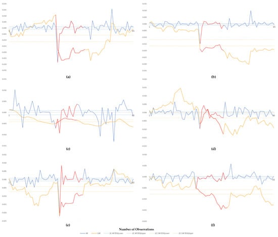 Abnormal returns (AR) and cumulative abnormal returns (CAR) on the event window for the following indices: (a) HSI, (b) JPXNK400, (c) KSE100, (d) BSESN, (e) CSI300, and (f) STI.