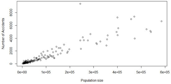 Model 1 (AUS 1): The first pair of variables that were selected were the number of accidents (ACC) and the population size (POP). These were chosen because we expected more accidents to occur in regions with a higher population relatively speaking. From the scatterplot in Figure 1 and Figure 2, it appears that there exists a strong linear relationship between these two variables, which is also supported by the associated Kendall’s and Spearman’s values in Table 2 (Column 4, 5, Row 1).