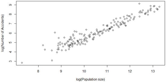 Scatterplot of the Swedish motor data (on a natural log scale).