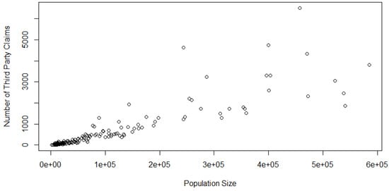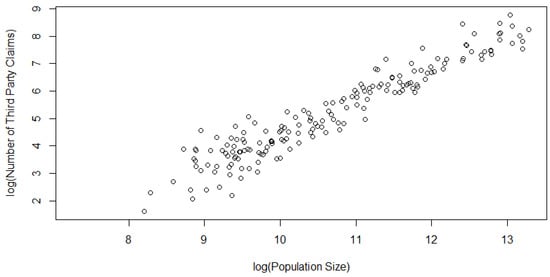 Model 2 (AUS 2): In this model, we consider the two concomitant variables under study, namely the number of Third-Party Claims filed (TPC) and POP. TPC happens if a driver’s negligence results in the injury or death of another driver; the affected party or their family have the ability to file a claim against the guilty driver’s insurance company. We consider studying the dependence between TPC and the population of a given region in Australia because one would expect a larger volume of third-party claims to be filed in regions with higher populations. Needless to say, this is a good source of information for car insurance providers. From the scatterplot in Figure 3 and Figure 4, it appears that there exists a strong linear relationship between these two variables, which is also supported by the associated Kendall’s and Spearman’s values in Table 2 (Column 4, 5, Row 2).