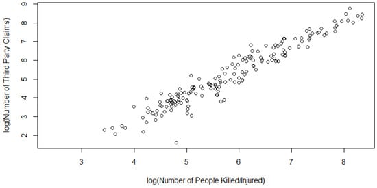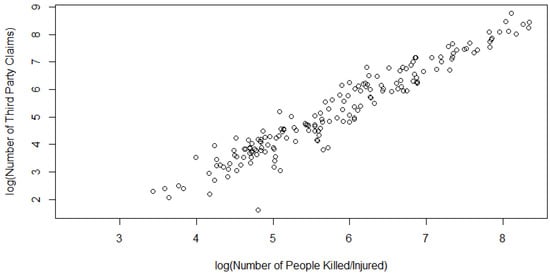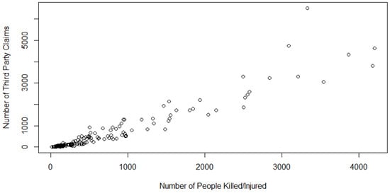 Model 4 (AUS 4): In this model, we consider studying the level of dependence between the number of people injured or killed in an automobile accident (K/I) and the corresponding number of third-party claims filed (TPC). As defined above in Model 2, third-party claims are filed in the event of an accident in which other drivers suffer injury from the negligence of another. While injury and death are not exclusive to the third party, we found a positive trend in the scatterplot of these two variables (Figure 7 and Figure 8). Hence, we chose to fit a copula to these two concomitant variables.