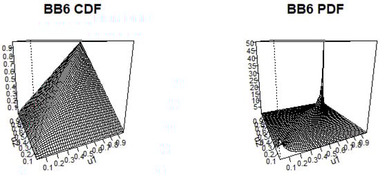 Therefore, the BB6 copula is not asymptotically independent. However, from the given expression for it is quite clear that as both and are close to is close to zero. This would imply that the BB6 copula is asymptotically independent in such a case. Furthermore, from the expression for , it appears that as the values of and increases, the value of increases. This implies the fact that this copula might not be that useful to model the dependence structure for financial data in general, as such tend to exhibit tail dependence, especially lower-tail dependence. However, if the data suggests that the estimated values of the parameters and are larger than one, then it may be utilized to model financial data, such as insurance data that exhibit some amount of tail dependence.